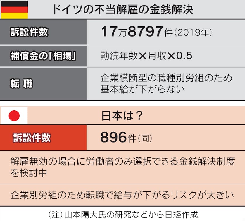 厚労省の検討会では、不当解雇の金銭解決モデルの一つとしてドイツの例が取り上げられた。ドイツ労働法に詳しい労働政策研究・研修機構の山本陽大・主任研究員によれば、同国では2019年に17万8797件と日本の約200倍の解雇訴訟があったが、ほとんどが労働裁判所での和解と補償金支払いで解決した。