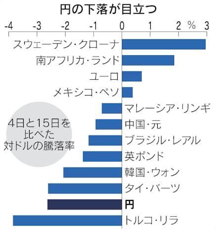 主要通貨が7日から15日まで対ドルでどう動いたかを比較すると、円は2.6%の下落と弱さが目立つ。トルコのリラや韓国のウォンなど資源を輸入に頼る国の通貨が下落の上位に並ぶ。
