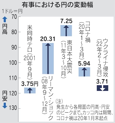 日本は世界一の対外純資産国で、市場に不安が広がると膨大な対外資産を日本の投資家が円に避難させるとの思惑から、外為市場では「リスク回避の円買い」が定着していた。2008年9月に発生したリーマン・ショック後の3カ月間で1ドル=106円台から87円台まで円高・ドル安が進んだ。11年3月の東日本大震災後は、1ドル=83円前後から80円割れまで円高が加速した。