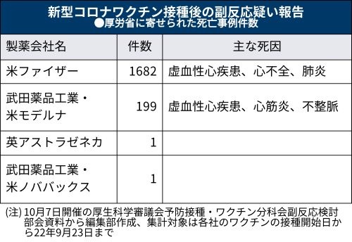 厚生科学審議会の予防接種・ワクチン分科会副反応検討部会の10月7日の資料によると、各社ワクチンの接種開始日から今年9月23日までに、医療機関や製薬会社から寄せられた接種後の副反応疑い報告には1900件近い死亡例が含まれていた。