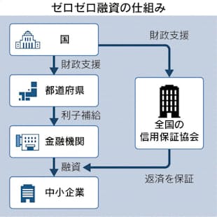ゼロゼロ融資はコロナ禍で売上高が減少した企業を支援するため20年3月に始まった。最長5年まで元金の返済を猶予し、最初の3年間は各都道府県が利子を補給することで企業側の利払いを実質免除。将来返済が滞れば公的機関である信用保証協会が肩代わりする。22年9月末までに民間と政府系金融機関で計約43兆円の融資が実行された。