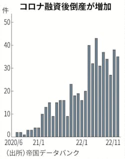 新型コロナの影響が和らぐのと逆行する形で、企業倒産が増えている。特に目立つのが、コロナ関連融資で食いつないだ企業が過剰債務で再建を断念する「息切れ型」倒産だ。帝国データバンクがコロナ関連融資を受けた後に倒産した企業を調べたところ、1~11月は合計で353件と前年同期の2.4倍になった。