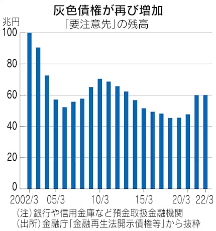 灰色債権とは、返済条件の変更や元利払いの猶予などが必要になった企業(要注意先)向けの債権だ。金融庁によると、2022年3月末の残高が60.1兆円となり、新型コロナウイルス禍が広がる前の19年3月末と比べて15兆円、約3割増加した。新型コロナの長期化で企業の事業環境は厳しい状況が続いた。米リーマン・ショック後のピークの約70兆円に迫りつつある。