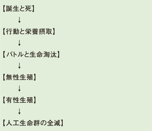 生命ですから「寿命」がある。「寿命」は生きているうちに減っていく。「食べ物」を得ることで少し寿命が復活する。敵に遭遇すれば「バトル」になり、条件を満たせば「生殖」して「子」を作り、生命群となる…といったシミュレーションを、プログラムで実現します。具体的には、以下のように段階的にプログラムを作成・調整していきます。