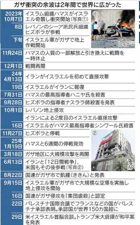 パレスチナ自治区ガザのイスラム組織ハマスが2023/10/07にイスラエルを越境襲撃して2年。